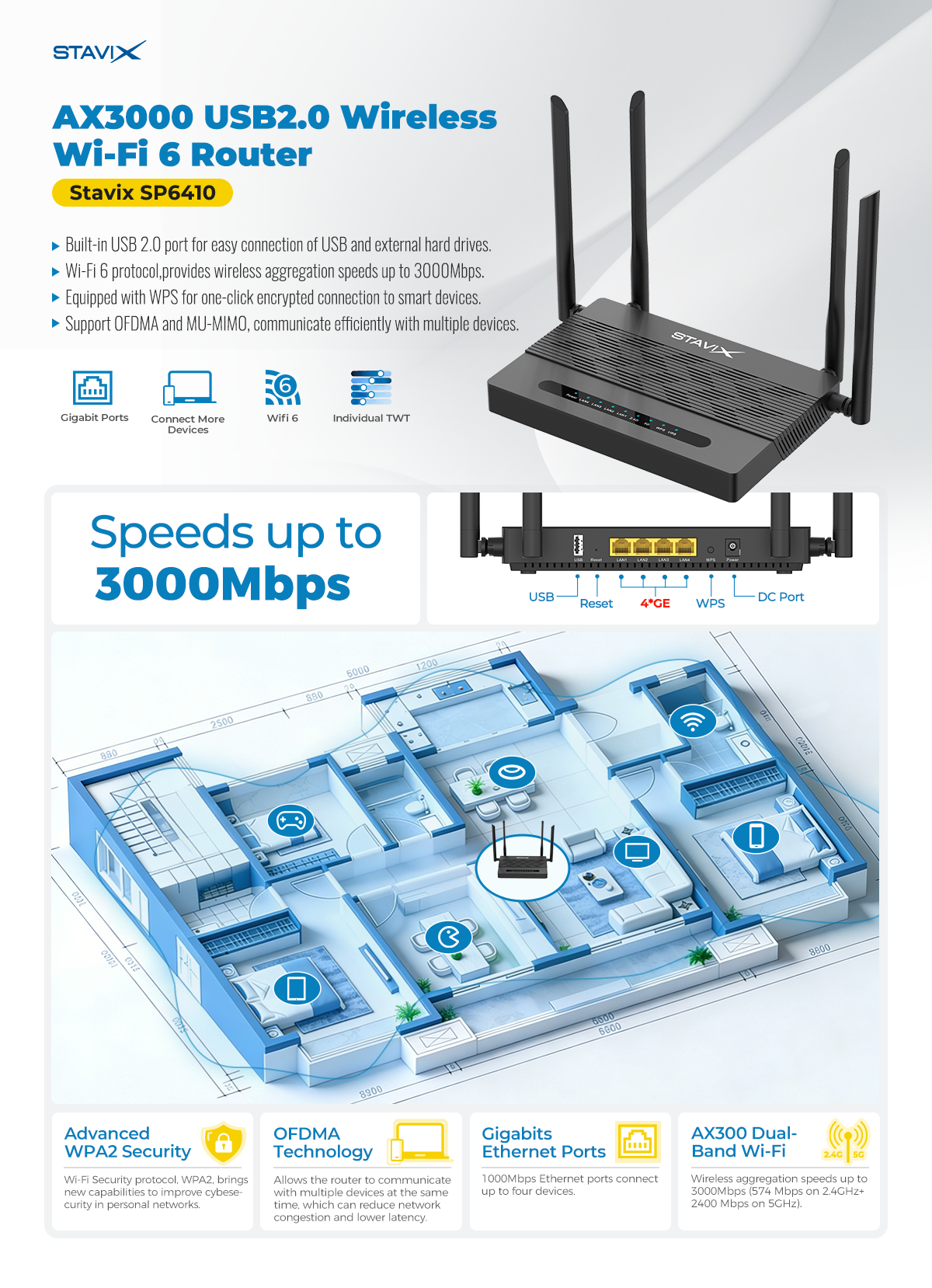l Wi-Fi 6 protocol,provides wireless aggregation speeds up to 3000Mbps.